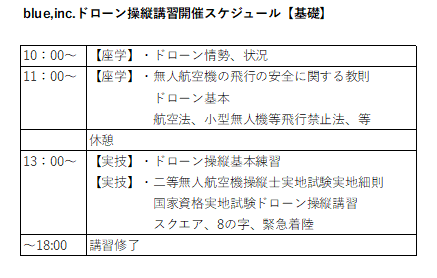開催場所:大津町野外活動等研修センター体育館、運動場 受講日時:1日間(10:00~18:00) 講習料金:79,640円(税込)※飛行実績証明証、ドローンレンタル料、保険料込み お申込み方法:随時募集